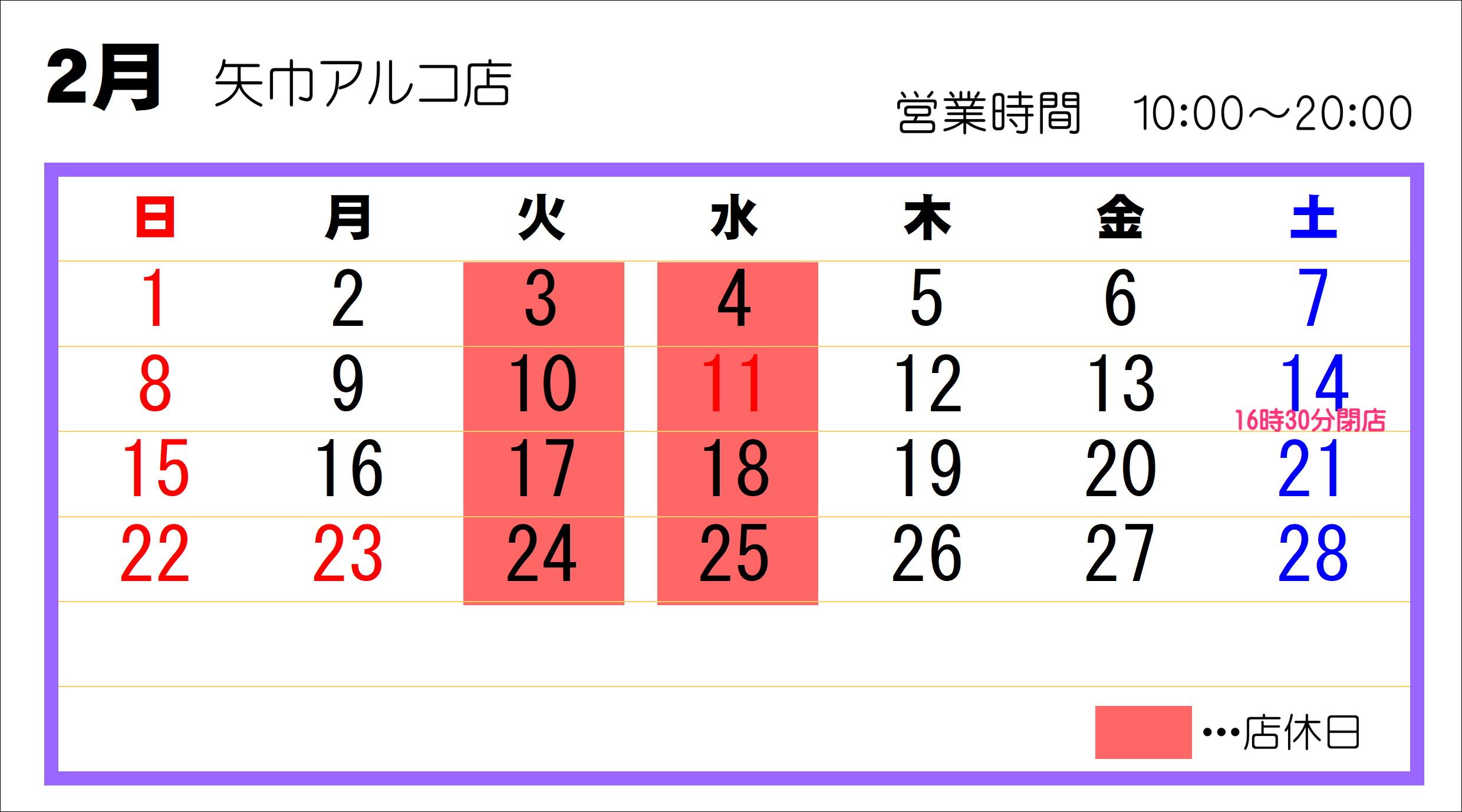 都合により2月14日(土)のみ 盛岡MOSSビル店16時閉店・矢巾アルコ店16時30分閉店とさせていただきます。 どうぞよろしくお願いいたします。